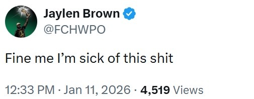 杰伦·布朗更推喊话道:“罚我款吧,我早就受够了这些破事。”